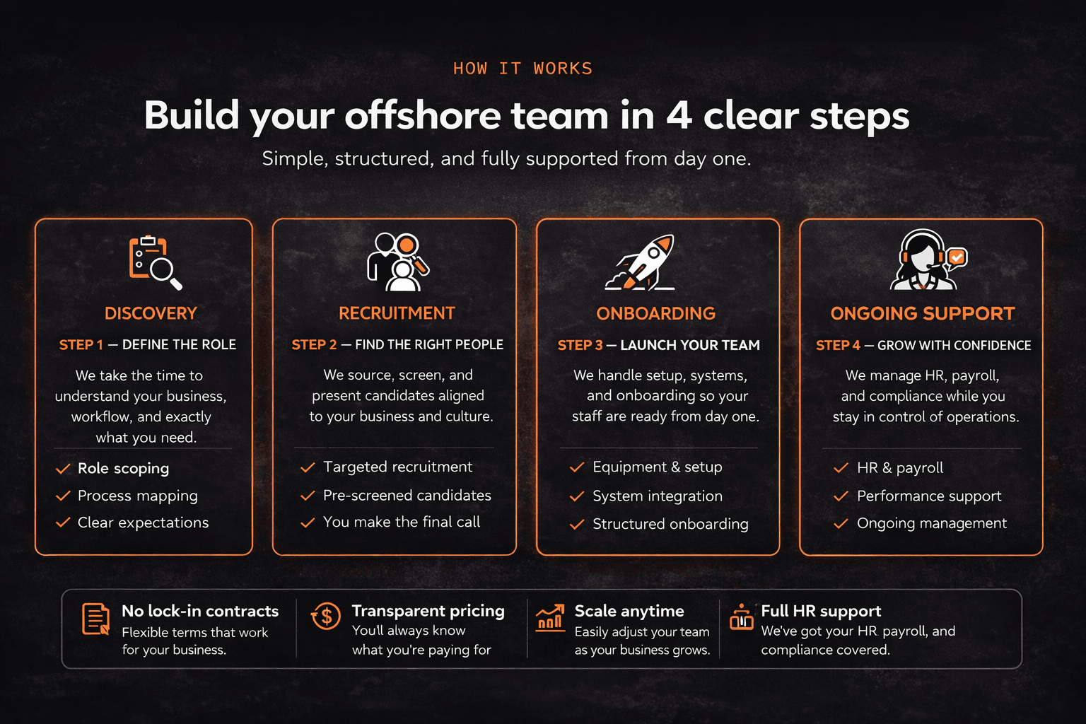 No outsourcing headaches. Just dedicated staff integrated into your business, backed by real operational experience.